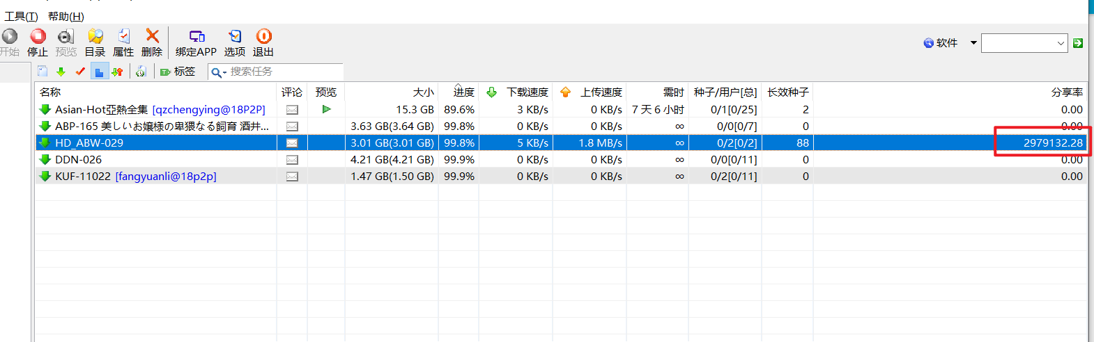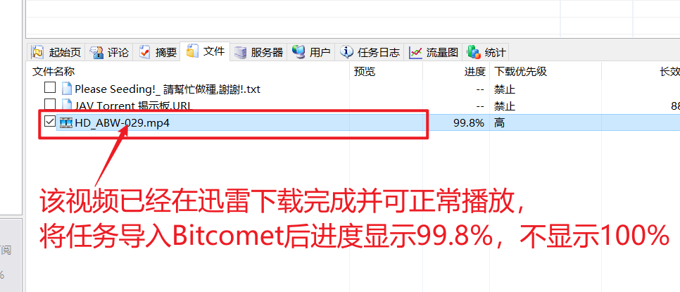 1- 导入迅雷已下载完成的任务到bitcomet,可正常播放的视频显示进度为99.8,不是100%