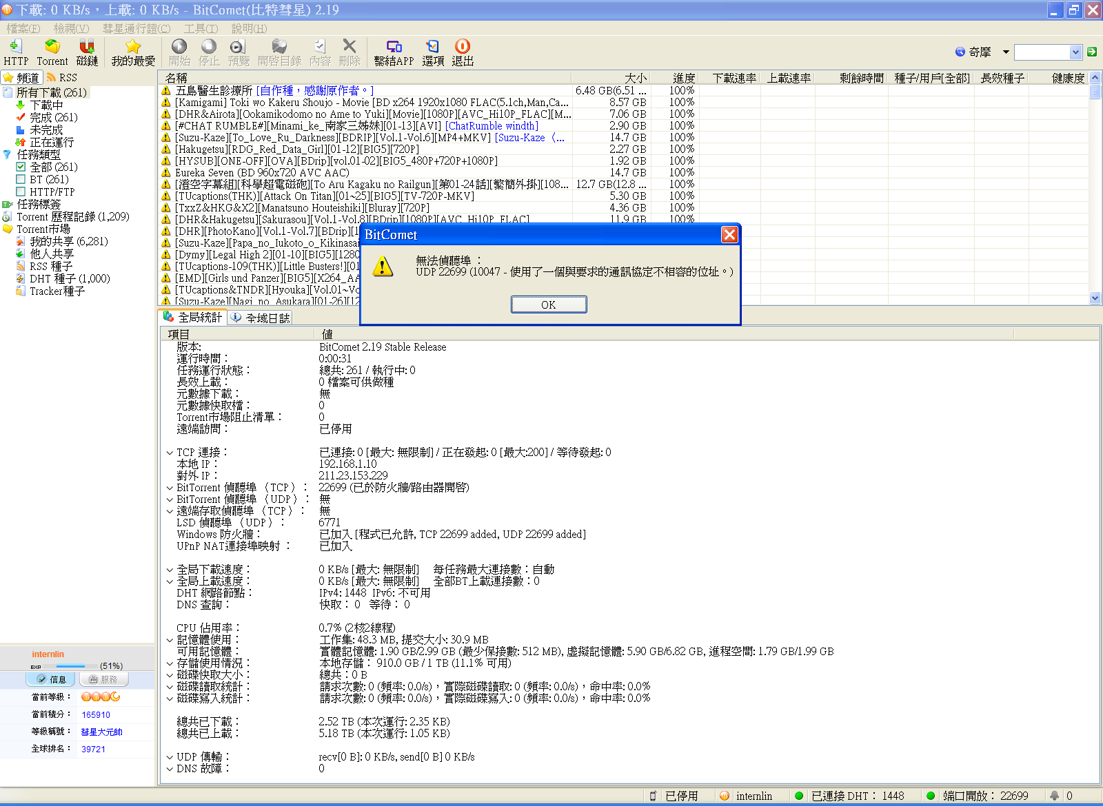【錯誤/Bug 回報】BitComet 2.19 開 port 錯誤,但 2.15 時是正常的。錯誤如附圖