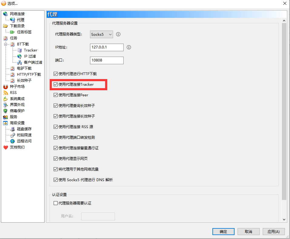 勾选 通过代理查找主机名 和 对 BitTorrent 目的使用代理,并且取消勾选 使用代理服务器进行用户连接~