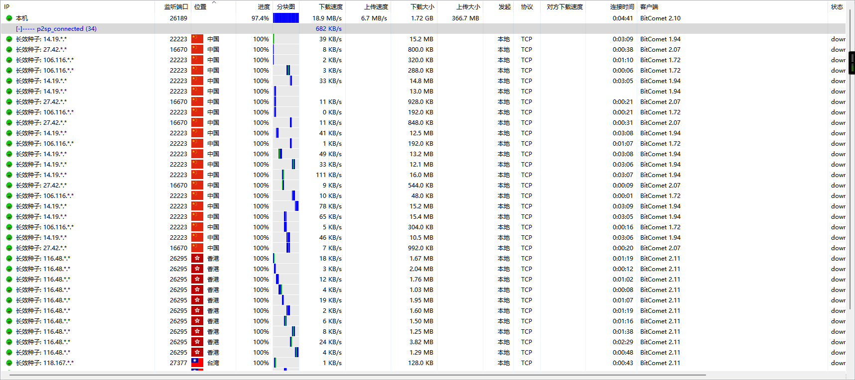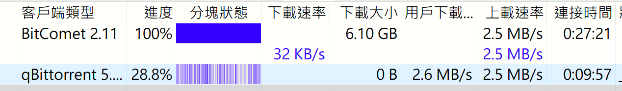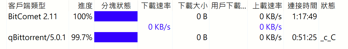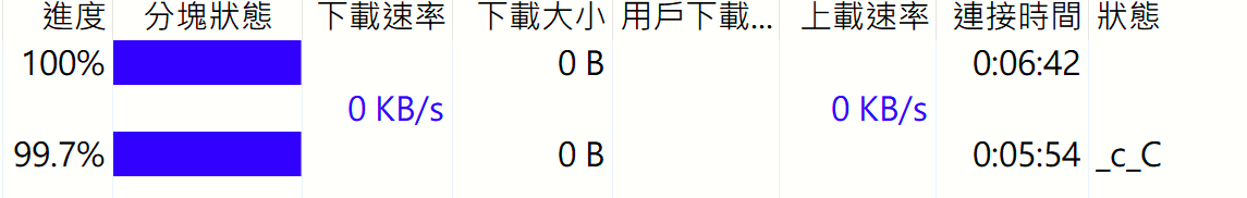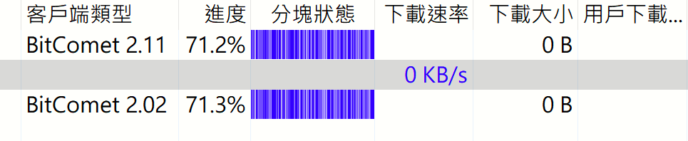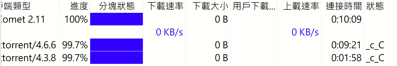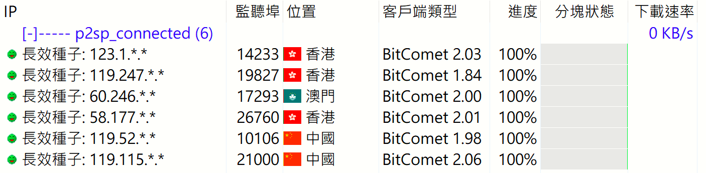 您沒看那些長效種子都只有一條綠色的線, 而不是一個個區塊嗎? 誰在傳給我, 誰在擋我, 一看就知道. 那麼多種子在一起, 0KB. 我也今天第一次見識到. 以前看到的只有一部份. 今天全體全在阻擋. 阻擋的事我經歷多了. 您可能沒看過吧. 況且, 我下載的是只有1集, 不是全集. 1集就是一整個區塊都滿才叫 100%. 我下載時是只下載視頻, 其他兩個幾百K的小段說明我沒下載, 所以推測他們可能只開放那兩個小檔案, 所以只有一條線, 出來貌似在要讓我下載, 但卻是 0KB, 就這樣.