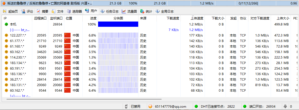 换个热门种子试一下,上传连接数看到只有极少的12个人,没什么人在下载,可能是下载方的问题