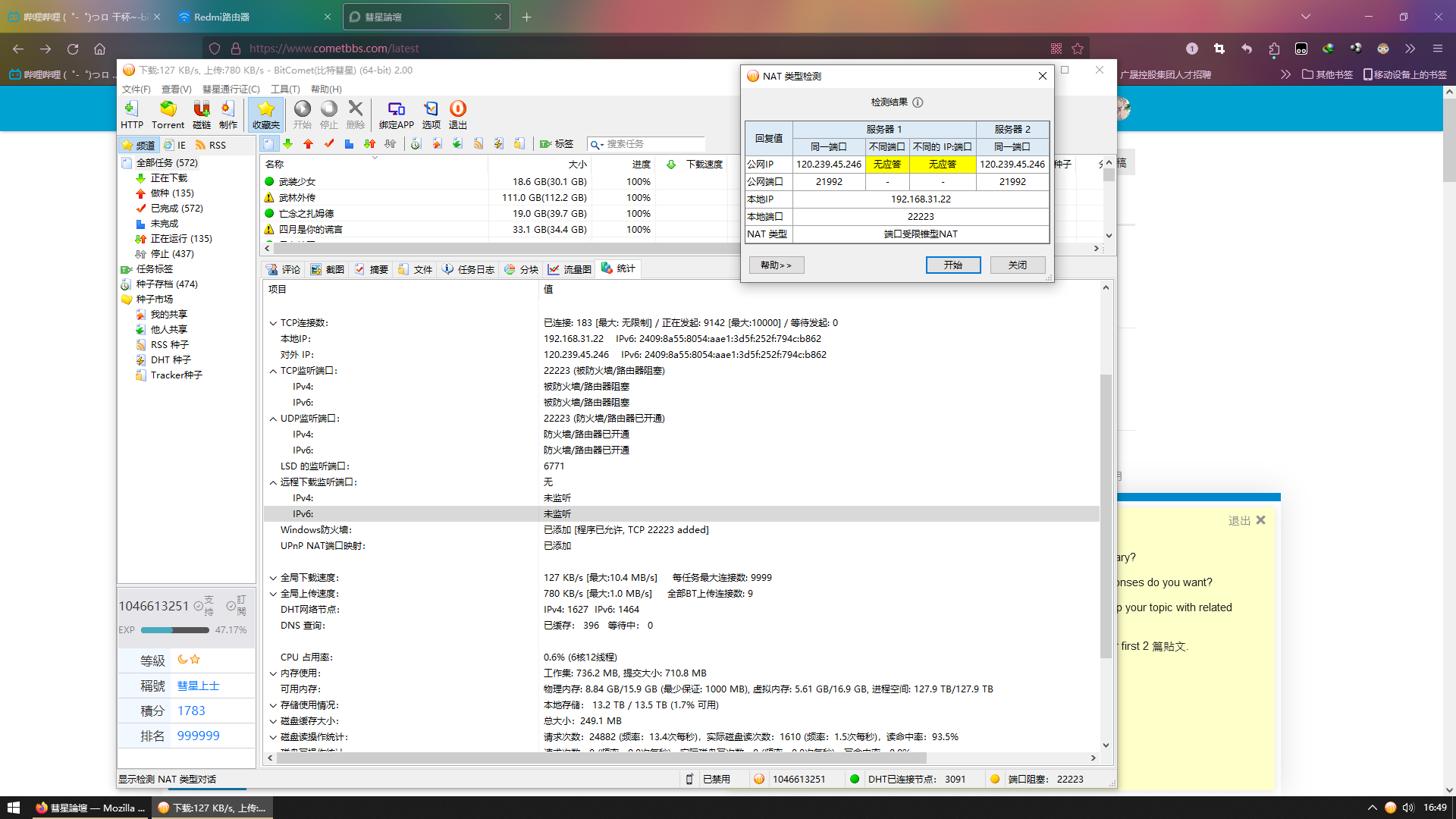 原来是折腾过双绿灯了用了大半年,移动宽带,主要折腾了路由器和光猫超级账户上的upnp和防火墙后就双绿灯了后果是家里电视机顶盒的iptv认证失败,现在家里老人有看电视需求遂安排师傅上门重置光猫后解决电视问题,但是比特彗星又端口堵塞了。现在ipv6检测还是通过10/10,路由器和光猫的upnp都打开了,防火墙也设置了,win防火墙也设置了出入站,端口还是原来的22223,但是没办法双绿灯了,求大佬们指教谢谢。