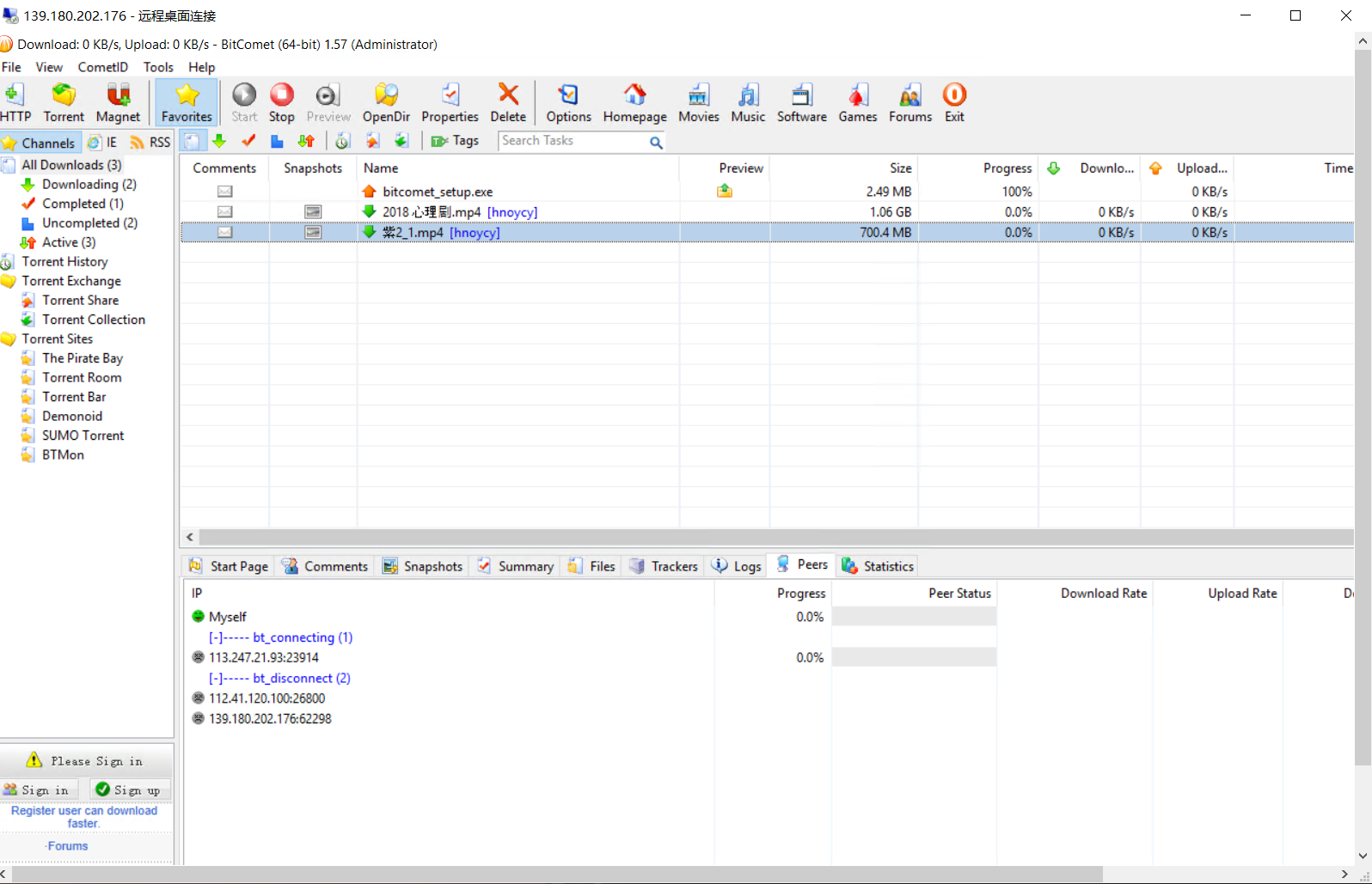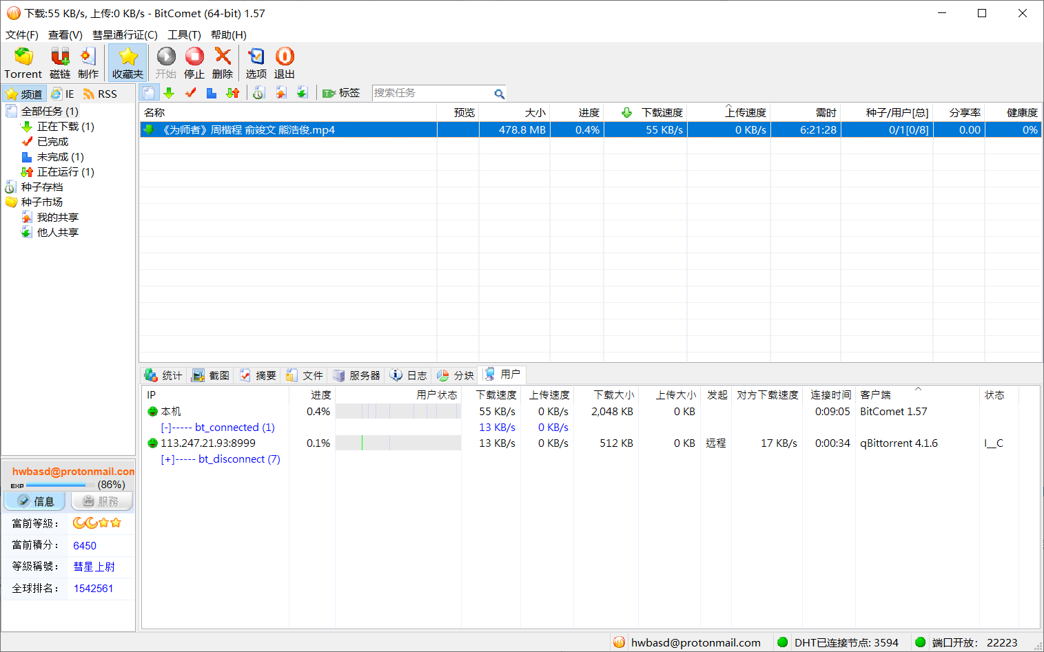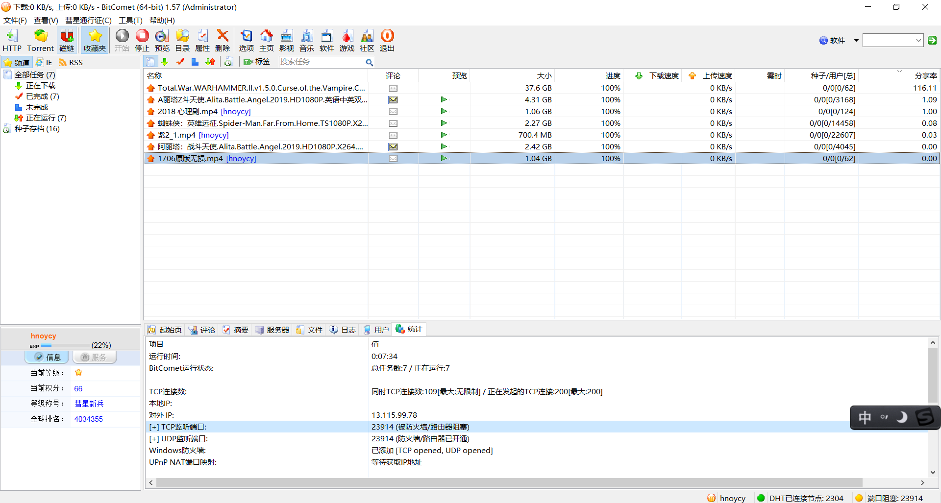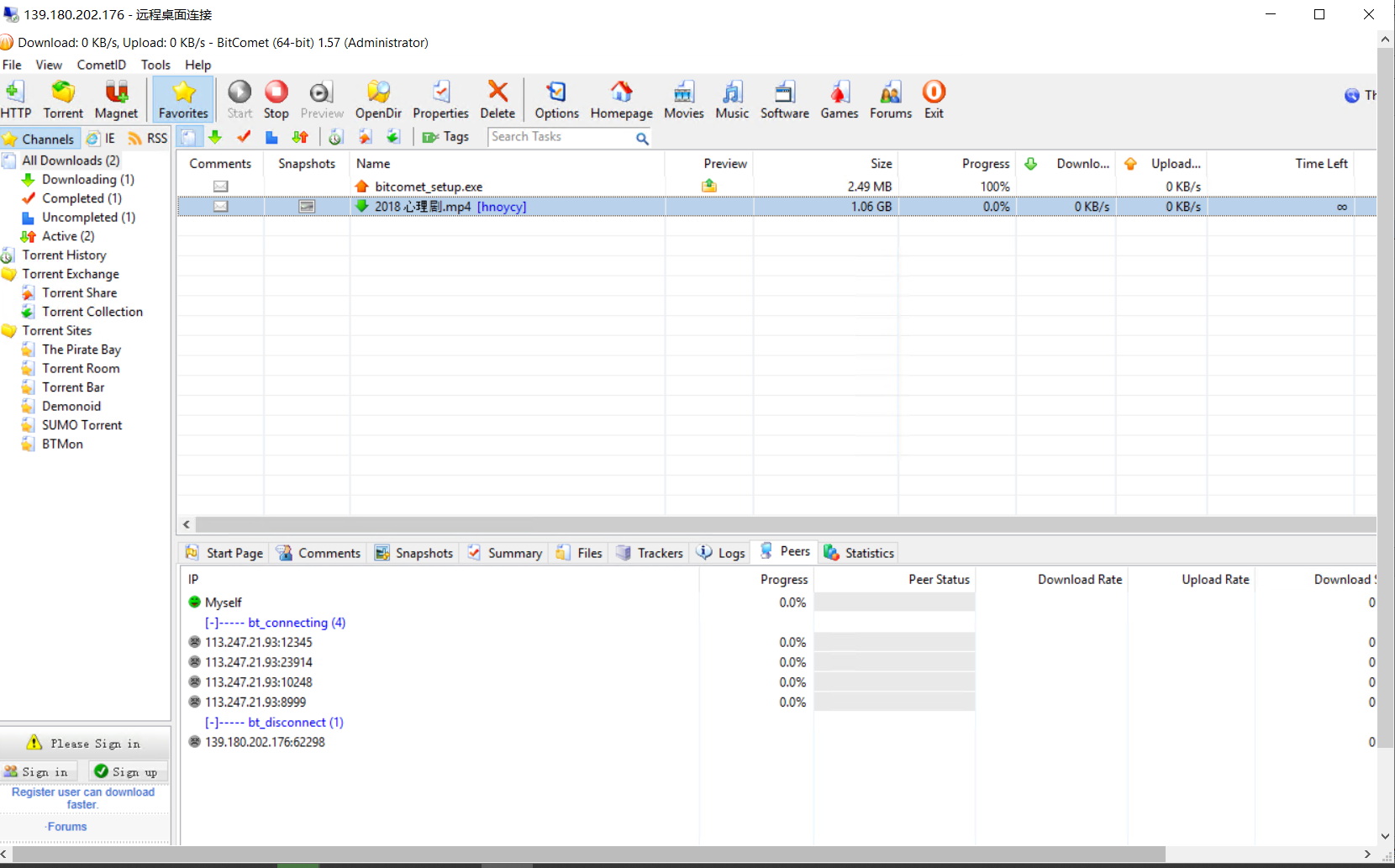 但是我在学校内网下的机器用比特彗星下载也没有速度啊,倒是昨天上面那位有公网ip的大佬下载了一下我的那个文件,我在学校的那个电脑有了1.3%的下载量,今天再也没能连上
