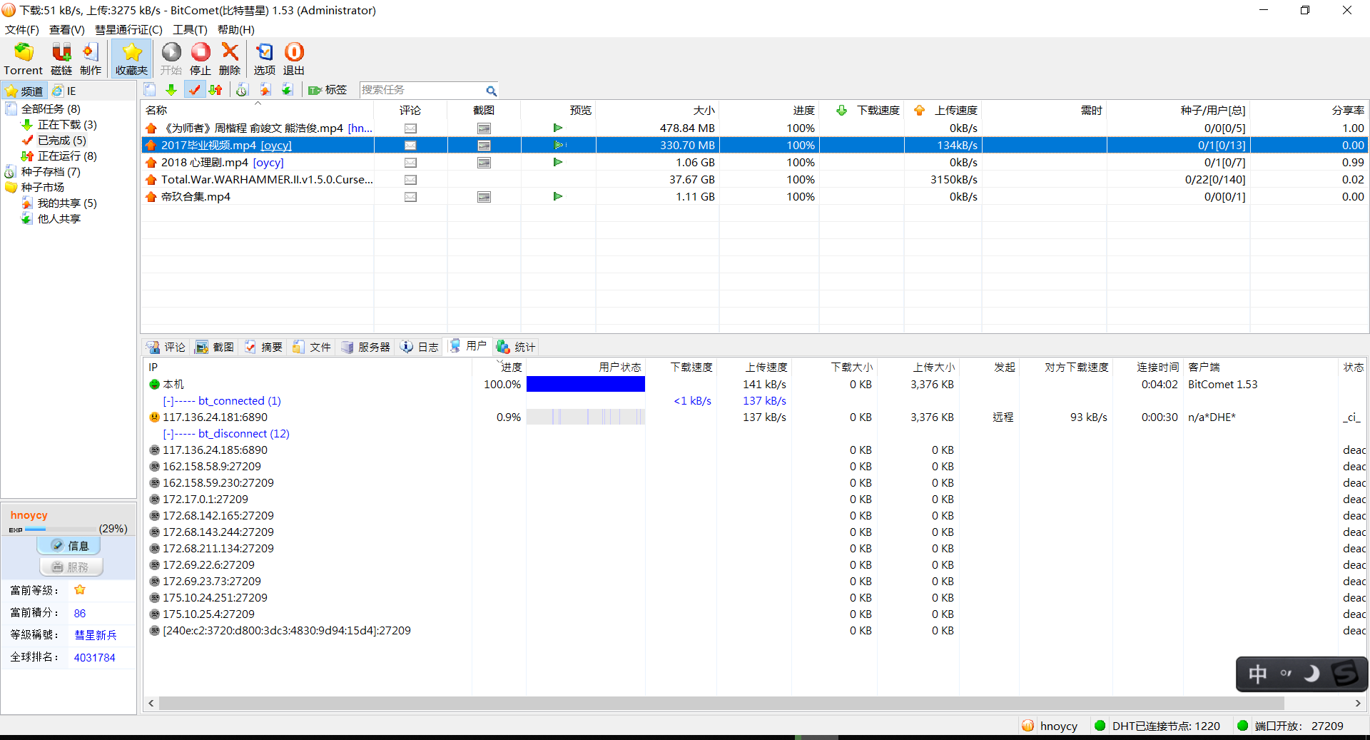 如果是小范围内共享文件我建议你用国产的微力同步来进行,原理还是跟BT一模一样,但是效率提升了很多,我以前共享170G的文件给别人就是用这个,基本满速上传不是BT软件可以比拟的。