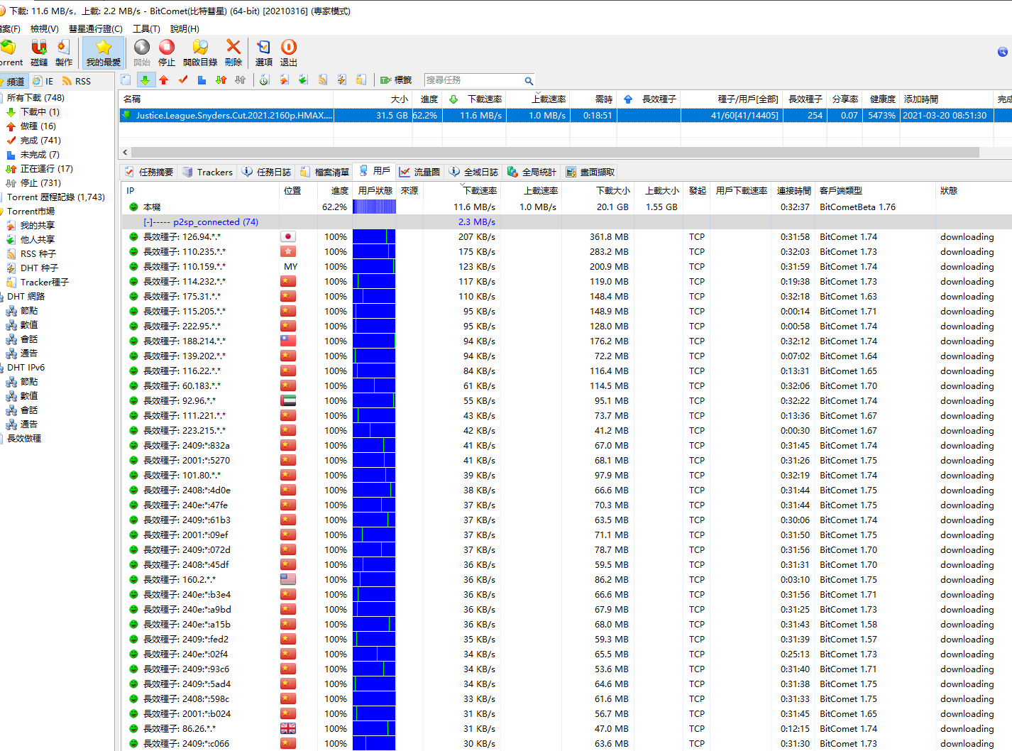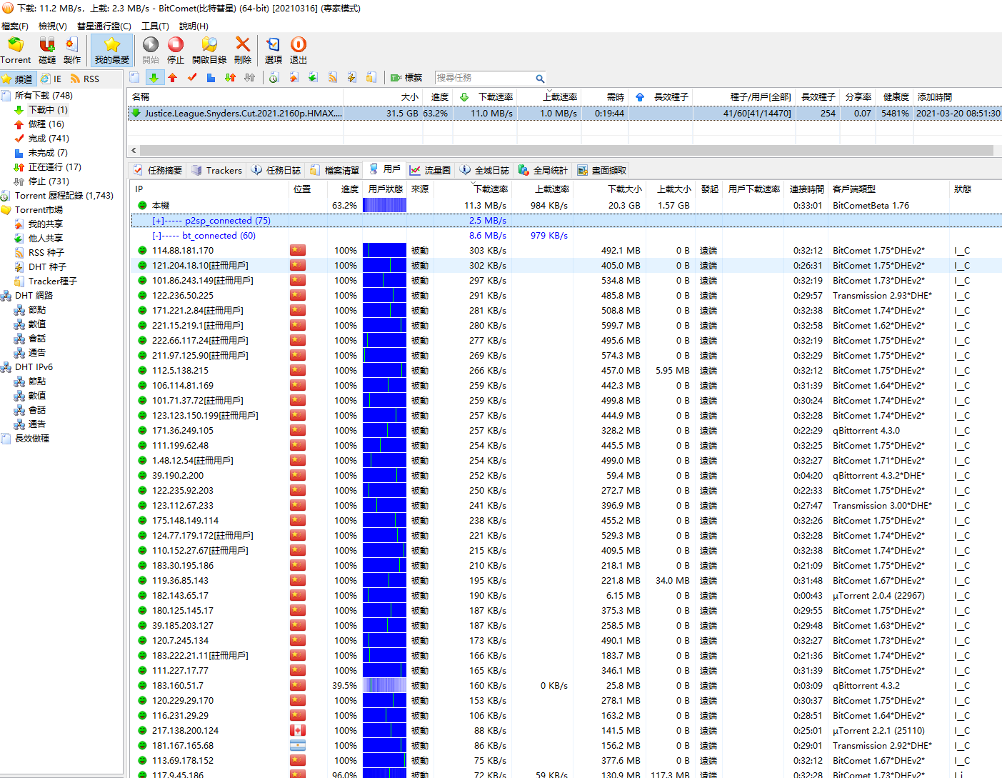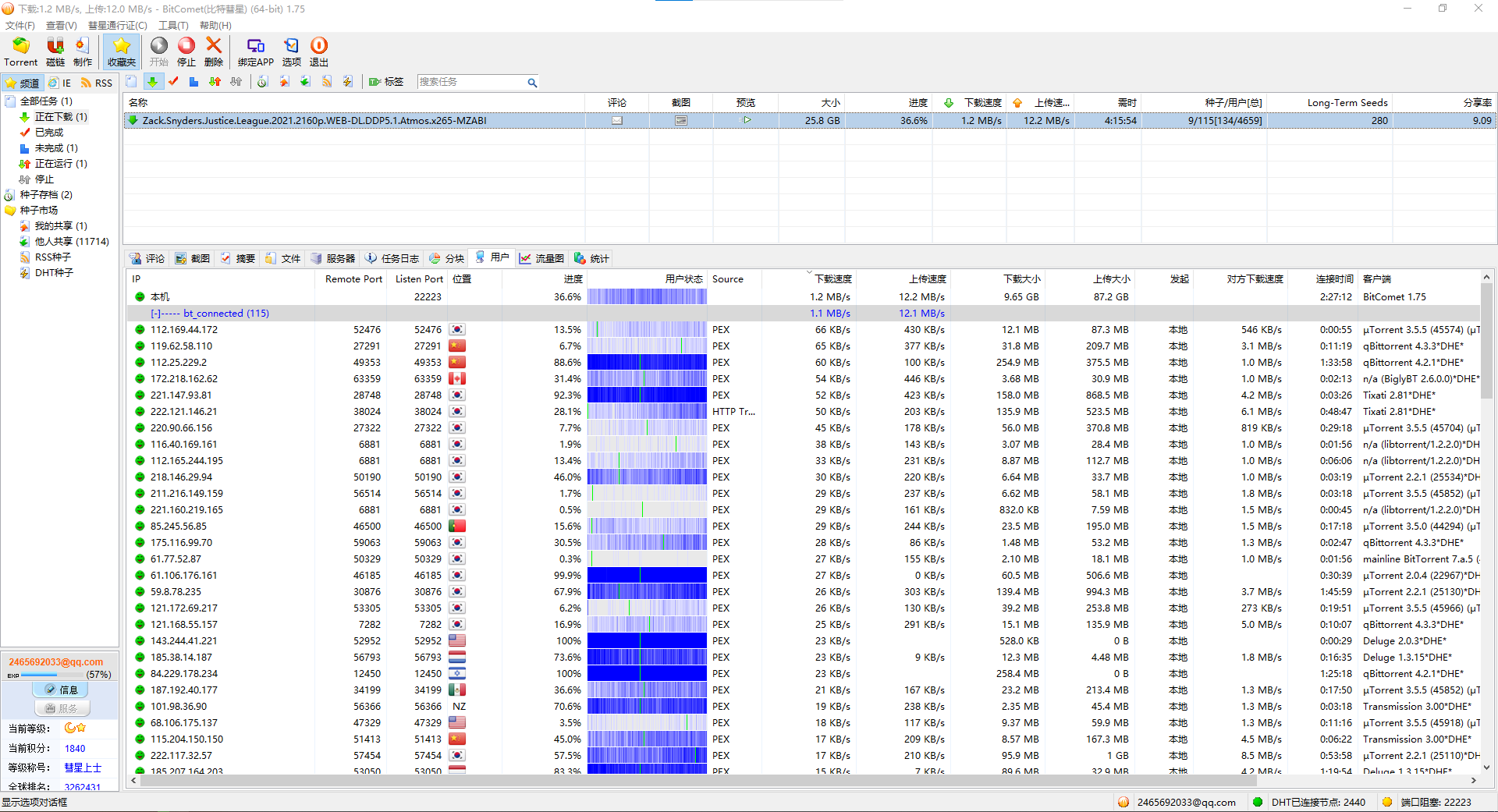 看图上应该是连上的种子少,9个种子,一百多个用户,说明你连上的用户大部分都是没下完的,你水管又大,自然上传量远大于下载量