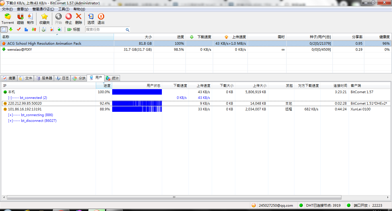 截图瞬间是40,波动到800多k时,也是迅雷下载速度高,那个bitcomet的客户端基本没速度,他没下载完,下载不会限速吧,限速也不会限制到20以下吧,bitcomet抢网速能力不如迅雷吗?