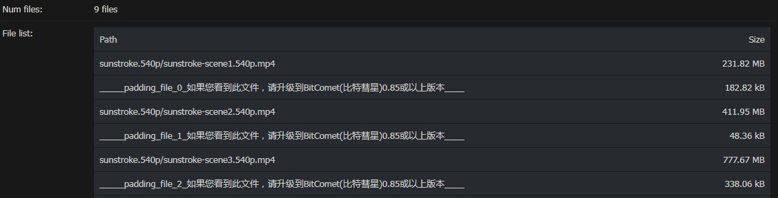 制作torrent时,若勾选这个功能,一些PT站网页端的文件列表会出现”_padding_file?如果您看到此文件,请升级到BitComet(比特彗星)0.85或以上版本" ,如下图