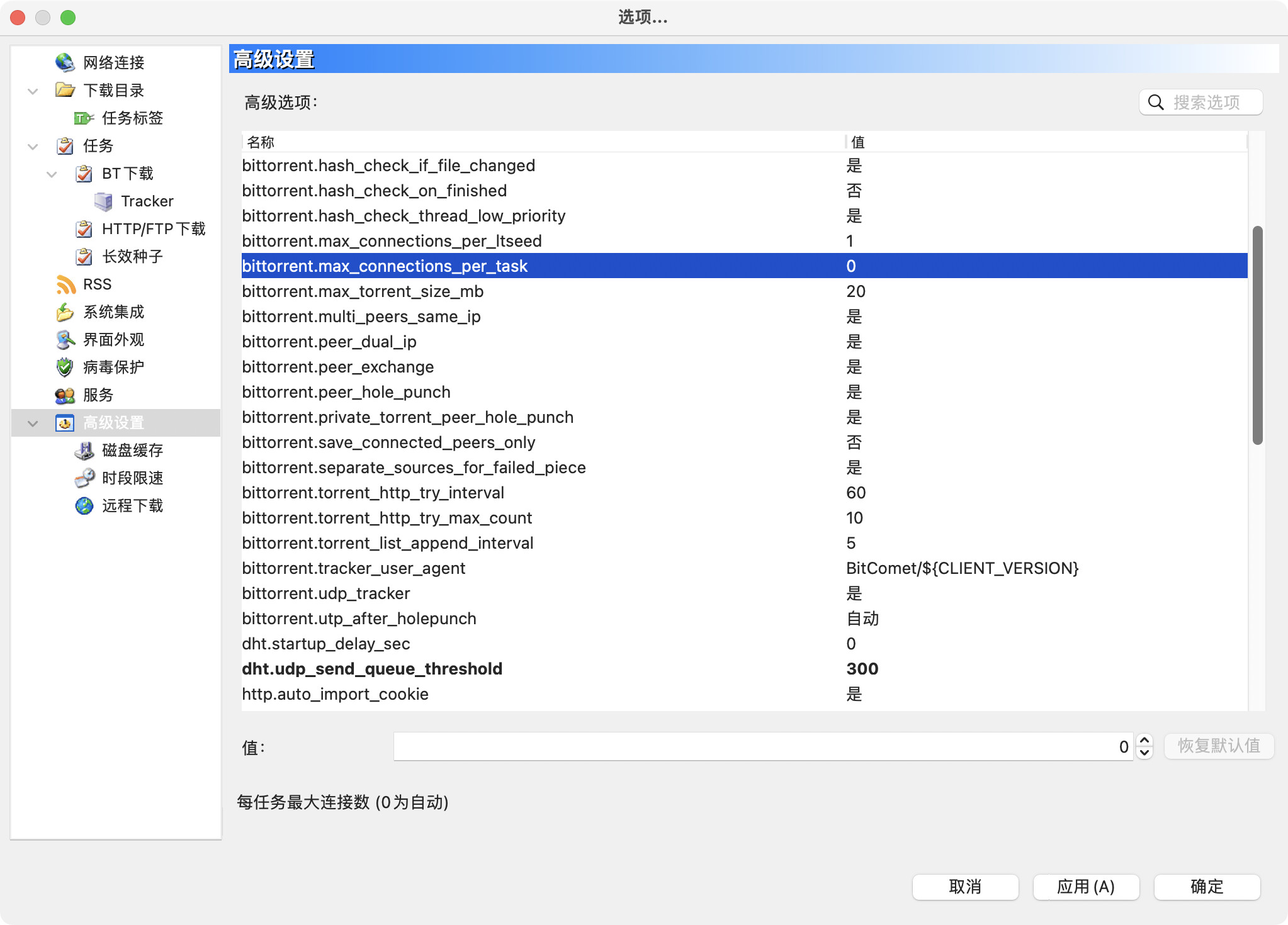 2、近期按照论坛大神攻略,从选项、高级设置修改了两个参数:network.max_udp_pkt_per_sec,调整为10,dht.udp_send_queue_threshold,调整为300,勾选掉“允许加入公众DHT网络”,下载新文件的时候,前一分钟网速3M左右,一分钟以后基本上就归零,稳定后下载速度60KB/s,以前2个小时的视频,现在3天也下载不完。