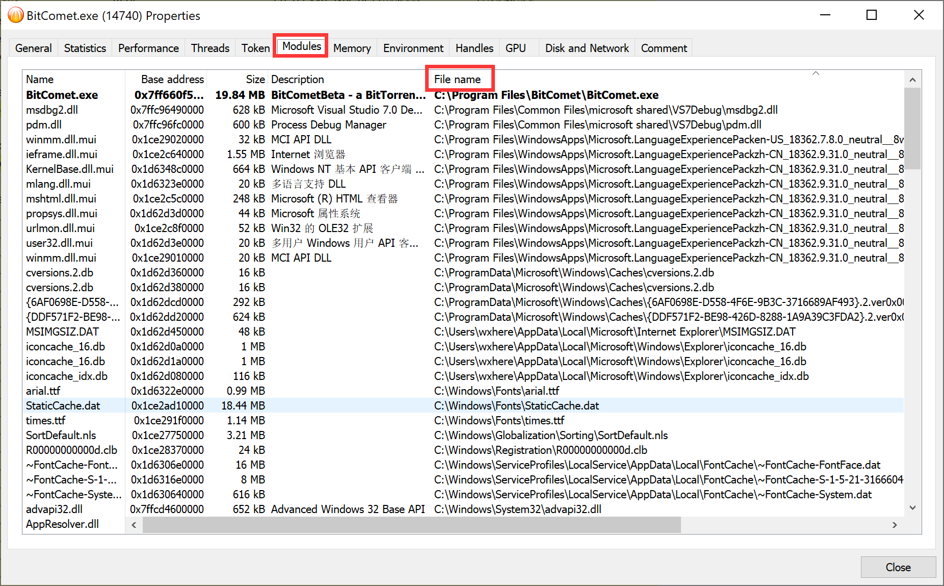 Process Hacker里双击进程,选择Modules页面。鼠标右键单击列表标题栏,选择choose columns。把File name列加入右边要显示的区域。