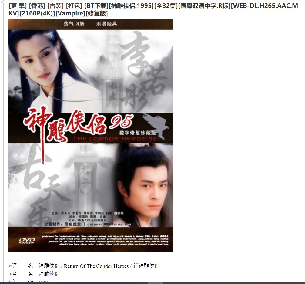 例如:吕颂贤版笑傲江湖、陈小春版鹿鼎记、古天乐版神雕侠侣等等这些经典的电视剧,哪位有好种子给分享下,多谢!!!
