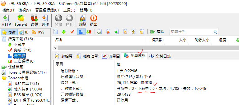 全局統計怎麽打開,我只能開單個統計,另外這個有什麽用?我現在問題是新打開磁鏈的話全部都是種子文件元數據下載中,一直是黃的沒法正常下載