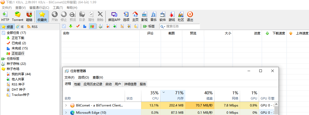 是的,磁盘占用最多的就是bt,现在把磁盘缓存调高了一些,磁盘读写没那么高了,内存顶不住,老电脑8G的内存,BT最高的时候能占到5个G,把BT退了之后一会电脑就流畅了
