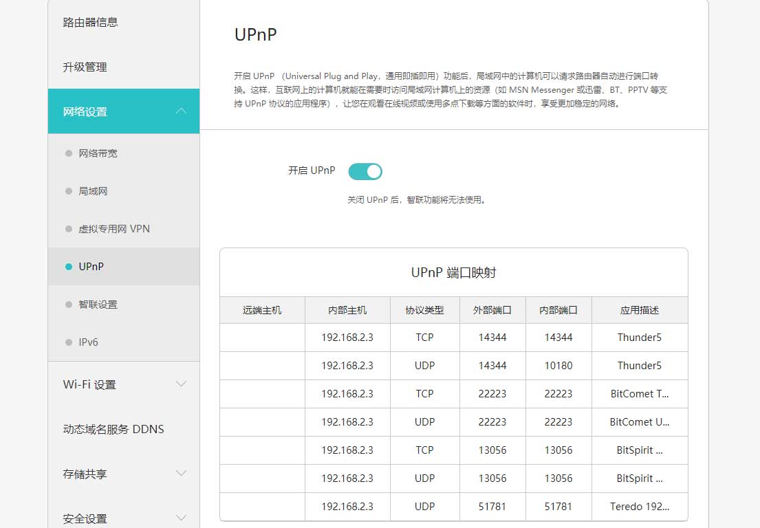 我在“网络管家”这个app下开启了upnp,但是看不到有被使用。BitComet也是显示为找到Upnp设备。我都不知道到底是谁出了问题。