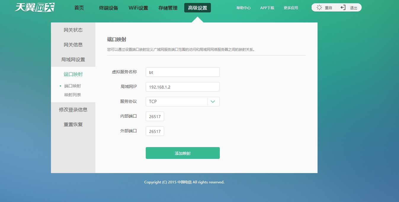 昨天刚开的公网。在qq电信里让客服开通。很简单。1小时多。电话回访。说开通的。在百度上ip.和电信网关里的ip一至。就是公网了。然后。端口阻赛问题,百度了下。先在win10系统里开了upnp等功能。改成自动。我想可能不用这步,也应该没问题。因为改前。发现win10系统里upnp等功能是运行着的。电信猫路由一体机,只有个千兆口。所以接出来后。连了一个华为的千兆路由。大多人都是这样的吧。多加一个路由。在华为路由里打开upnp功能。。bt的,tcp端口一直阻赛中。然后进电信猫路由一体机,电信猫路由一体机是没有upnp的选项的。我的显示是。端口映射,点进去。就可以添加tcp端口映射等。如果像我一样。猫路由连出来后。多一个华为路由。局域网ip一定要选对。别选你电脑上的ip.选华为路由的ip…端口写bt的端口。添加完。tcp就通了。。。。。很简单就搞定了。为什么看很多人说得很复杂!!!!!!!