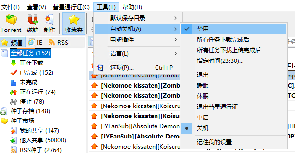 之前用的是1.53的中国版,昨天换成1.64国际版后没有找到下载完成后自动关机的选项,记得以前是有的。有些资源在晚上速度很快,但我并不想让电脑下载一夜,下载完成后自动关机还是很有必要的。