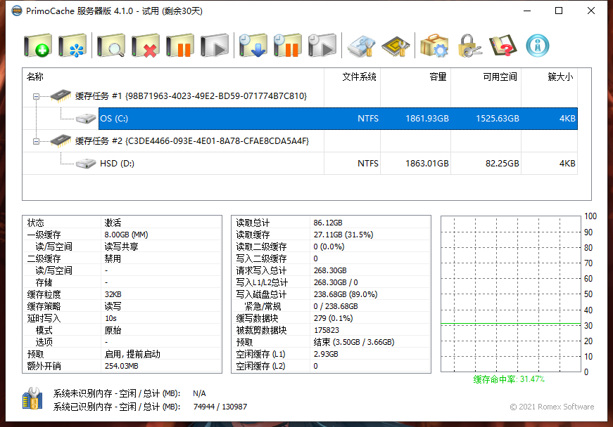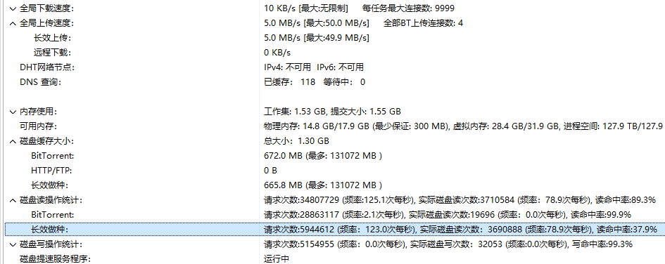 服务器A做种,服务器B仅使用长效下载,服务器A的读取命中率应当为99.99%以上,降低服务器A实际读取次数不应超过1次每秒