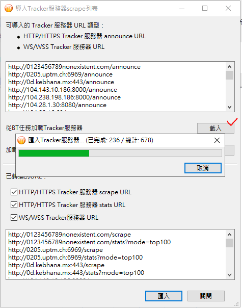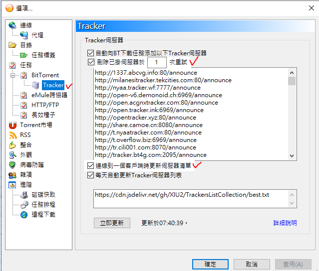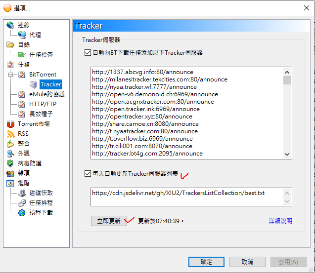 這倒是不需擔心, 就算一時網路異常, Tracker list 主要來源可以由 每天自動更新Tracker 伺服器列表匯入, 或者手動立即更新, 重新激活…