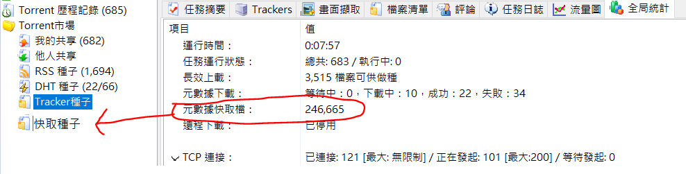 这个统计数字只是 他人共享 + RSS种子 + DHT种子 + Tracker种子 四个列表里下载的元数据数量总和。