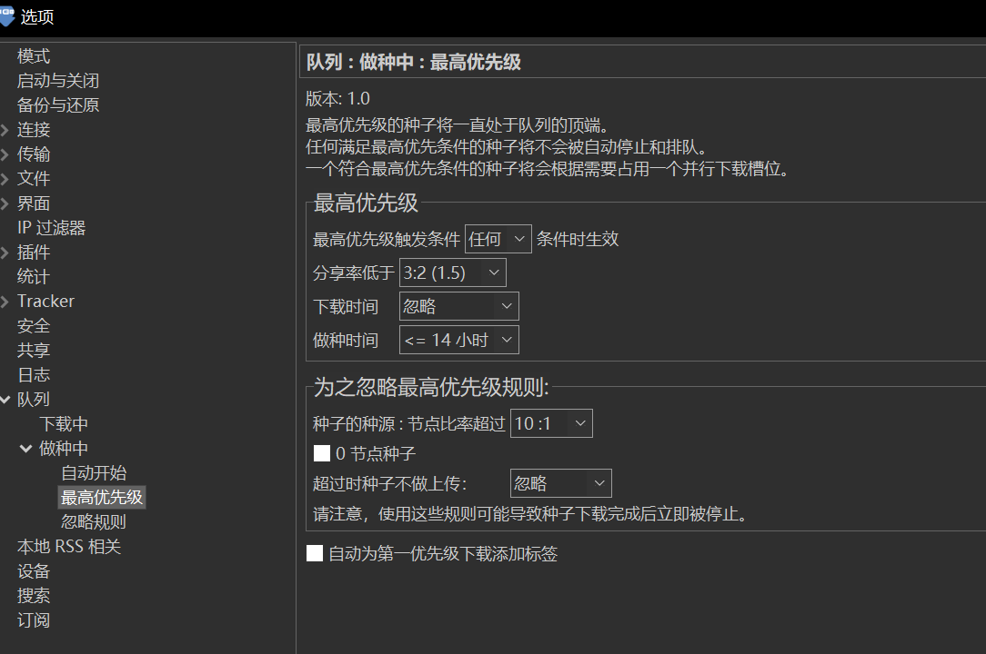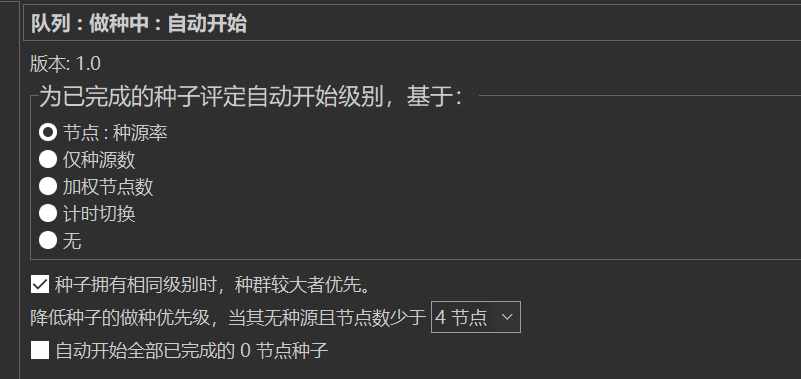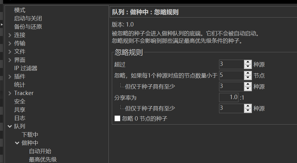 我现在的设置是当分享率满足且种子有充足的种源时将任务移动到队列中暂停做种节约带宽和资源,但如果一旦种源不足或者下载者较多,现有种源应付不来时,自动从队列启动任务开始做种。