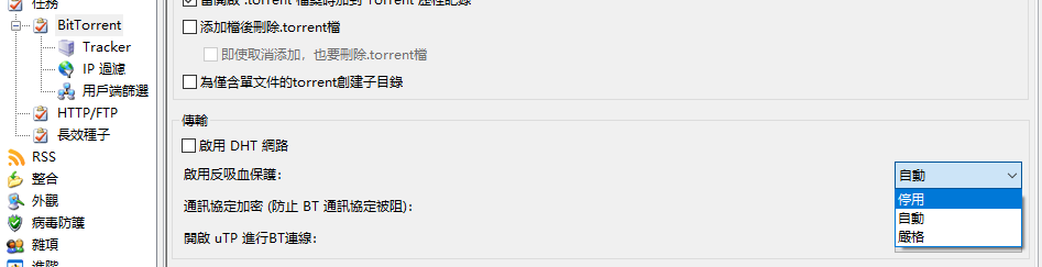 现在反吸血总开关设置禁用后,无法和以前版本一样实现关闭客户端过滤器,以前版本禁用反吸血开关后,可以在保留客户端清单的情况下实现关闭高级设置中的客户端过滤(bittorrent.anti_leech_banned_ports、bittorrent.anti_leech_banned_peer_ids、bittorrent.anti_leech_banned_client_names)