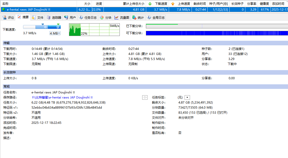或许也可以针对大分块任务(比如32MB及以上分块),每个分块存储为1个 “.piece_part.bc!” 文件,全部存放在任务设置的子目录下的1个隐藏文件夹内。小分块任务保持现状。也是个方法。