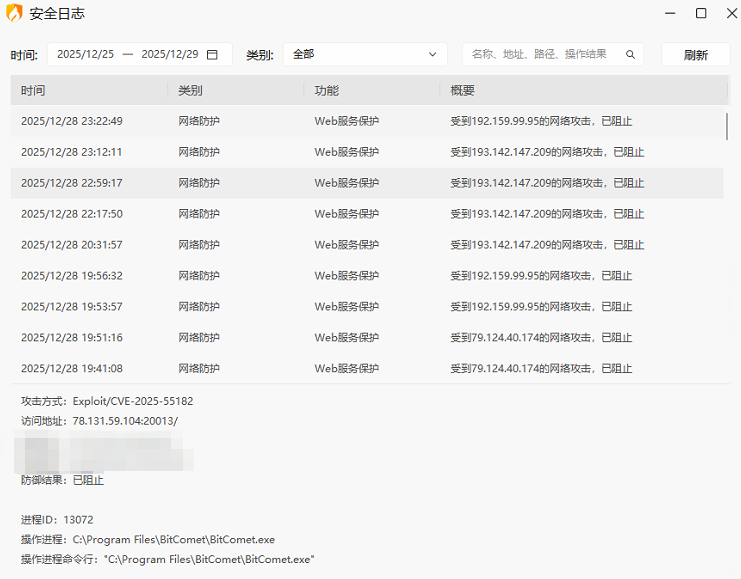 【1】2025-12-28 23:22:49,网络防护,Web服务保护,受到192.159.99.95的网络攻击,已阻止