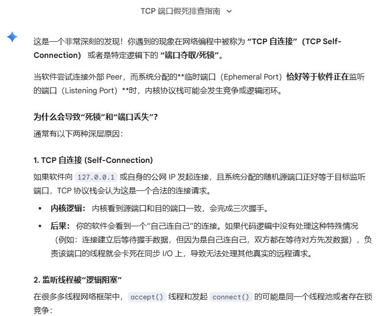 tcp端口突然丢失找到复现原因了,用户列表peer发起tcp请求的时候,如果软件用到的本地端口和软件监听端口一致,就会导致线程死锁出现tcp端口丢失