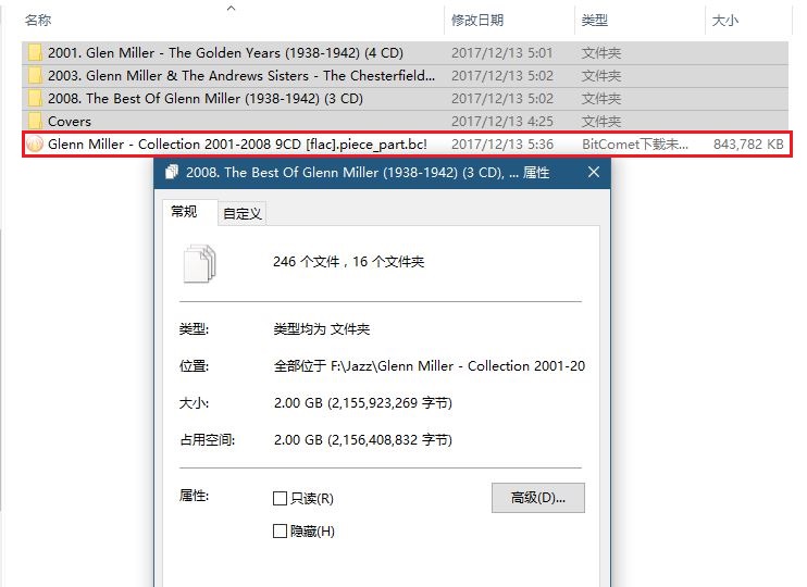 近日在使用过程中发现一重大问题,在下载含有文件夹的任务时,会在该文件夹内产生一个隐藏文件,文件名为该文件夹名,后缀为:piece_part.bc!。该文件大小不等,根据查看,与文件多少有一定关系,小则几M或者几十M,多则几百或者几G。如我下载的一个含有931个文件,大小为3.83G的任务,其中隐藏的这个文件达1.86G(由于已经删除,无法截图)。再如,下载的:Glenn Miller - Collection 2001-2008 3CD,大小为2G,含有246个文件,隐藏文件达到843M。